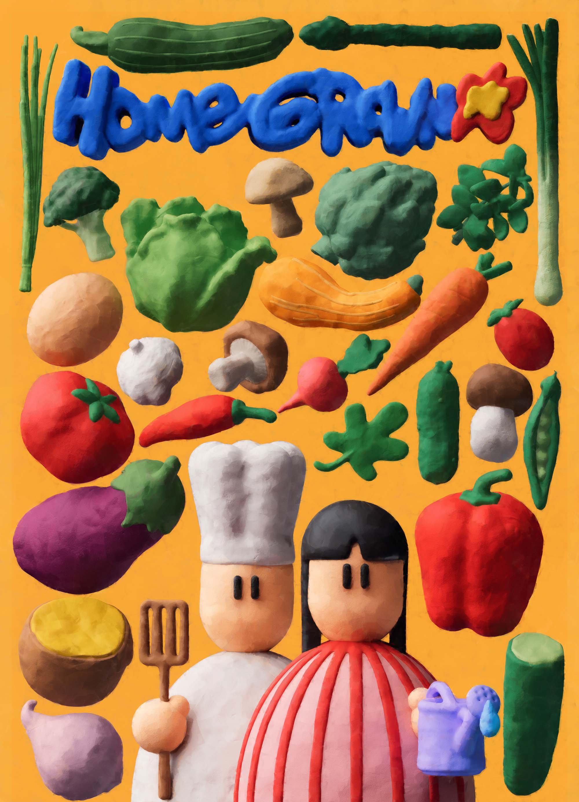 This 3D illustration was created in 2025 for some close friends. I aimed for a playful, handmade look reminiscent of clay or Play-Doh, giving the scene a tactile, whimsical quality. The composition features an assortment of vegetables carefully arranged, with attention to color, texture, and form to enhance the handcrafted aesthetic. The project was an exploration of stylized 3D modeling and rendering techniques that evoke a sense of warmth and playfulness.