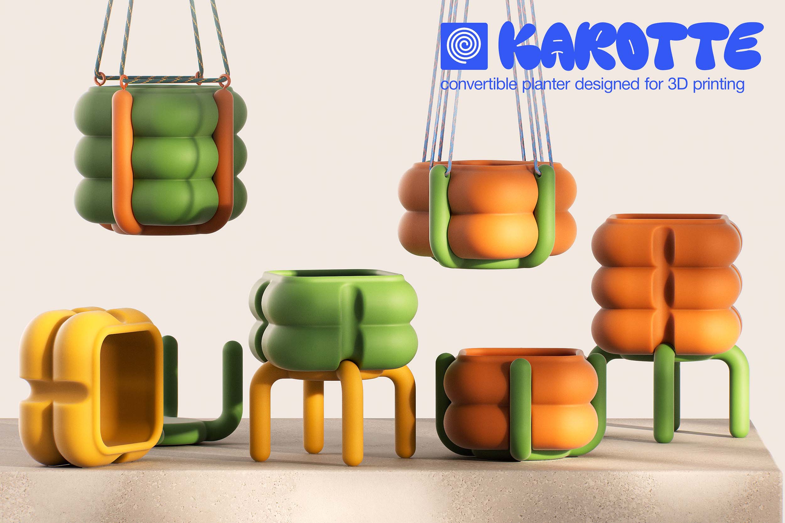 The Karotte Planter is a convertible 3D-printed object combining a planter and a tray, with the tray also functioning as a stool. Designed for easy 3D printing, it is composed of two separate parts: the main planter and the multipurpose tray, which can additionally serve as a hanging system. The default color scheme—orange planter and green tray—evokes a playful carrot look, though alternative colorways can also create cool variations. The design is intended as a versatile, functional object that integrates smoothly into any home environment.