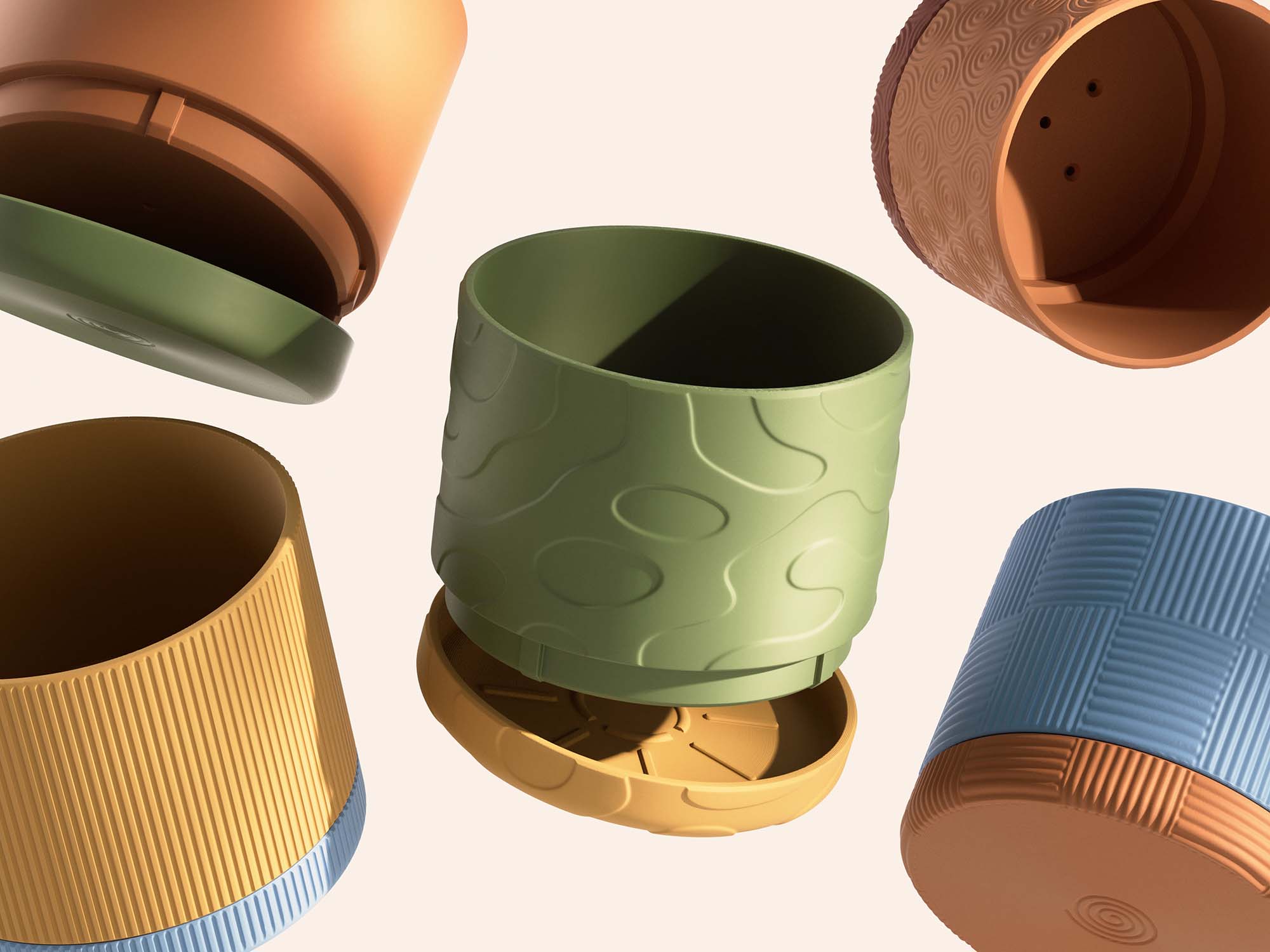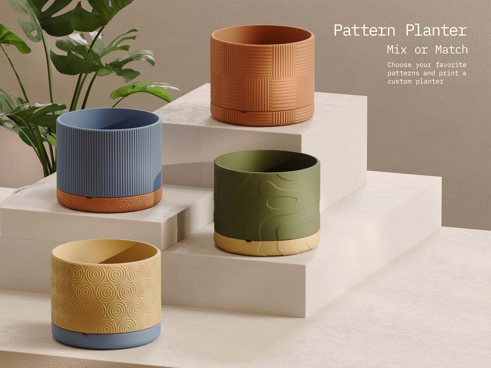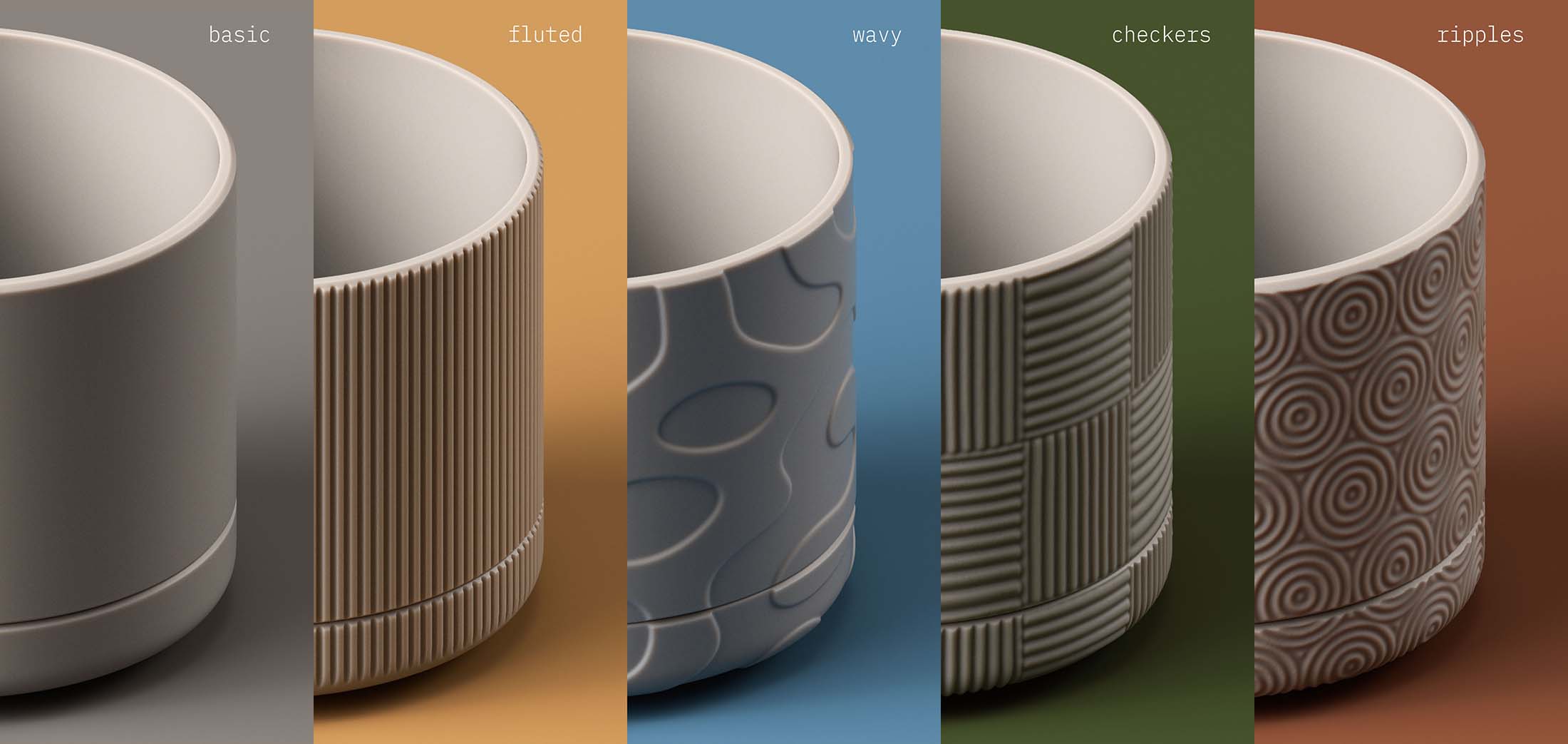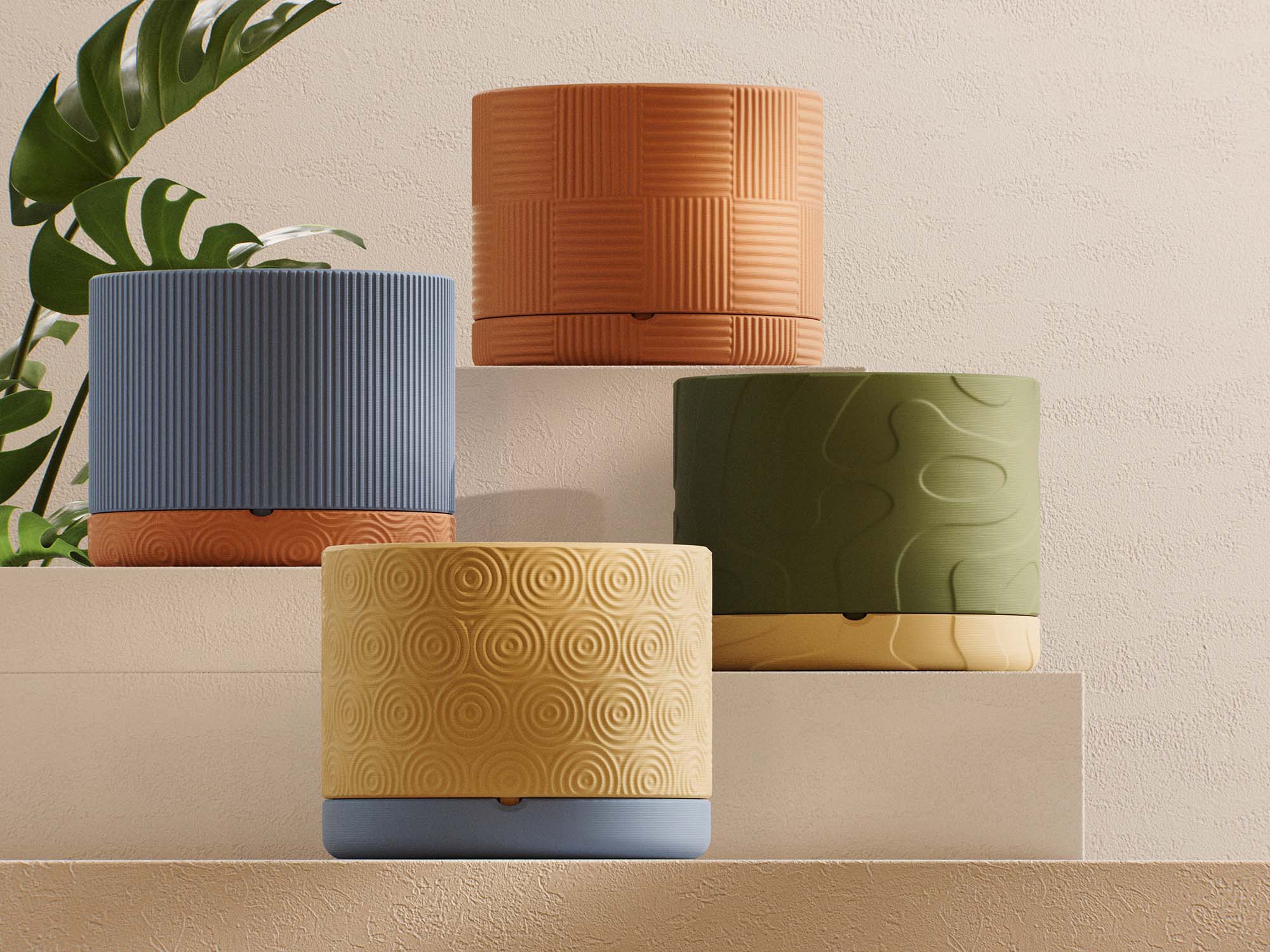 A modular 3D planter system exploring interchangeable surface patterns and form variation, designed with a clean aesthetic and optimized for accessible, everyday 3D printing.